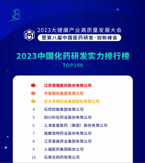 由药智网、中国药业杂志社主办的2023大健康产业高质量发展大会暨第八届中国医药研发•创新峰会于6月16日开幕,会上发布了《2023中国药品研发实力排行榜》系列榜单,AG体育医药凭借深厚的创新研发实力再创辉煌:荣登《2023中国药品研发综合实力排行榜TOP100》榜首、《2023中国化药研发实力排行榜TOP100》榜首。值得一提的是,今年是AG体育医药连续第6年入选《中国药品研发综合实力排行榜》榜首。