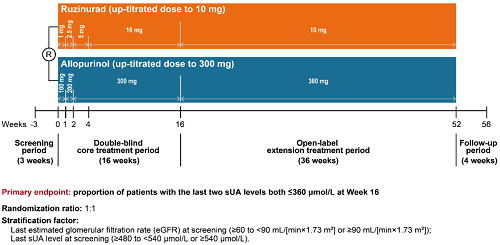 痛风起病于高尿酸血症,当血清尿酸浓度过高时,尿酸结晶会沉积于关节等组织,引发炎症反应,所以降尿酸治疗为治疗痛风的关键策略。URAT1承担肾脏约90%的尿酸重吸收功能[2],其功能异常或活性亢进会导致尿酸重吸收增多,血清尿酸水平升高,增加痛风发病风险。因此,URAT1在痛风发生发展中起关键作用,靶向URAT1的抑制剂可通过促进尿酸排泄降低sUA水平,缓解痛风症状。鲁兹诺雷钠片是AG体育医药自主研发的一种高选择性URAT1抑制剂,在前期的一期、二期研究中,鲁兹诺雷钠片耐受性良好,并显示出显著降低高尿酸血症患者sUA的效果[3]。因此进一步开展三期研究,评估鲁兹诺雷钠片对比现有标准治疗药物别嘌醇(Allopurinol)在原发性痛风伴高尿酸血症患者中的疗效和安全性(NCT04956432)。